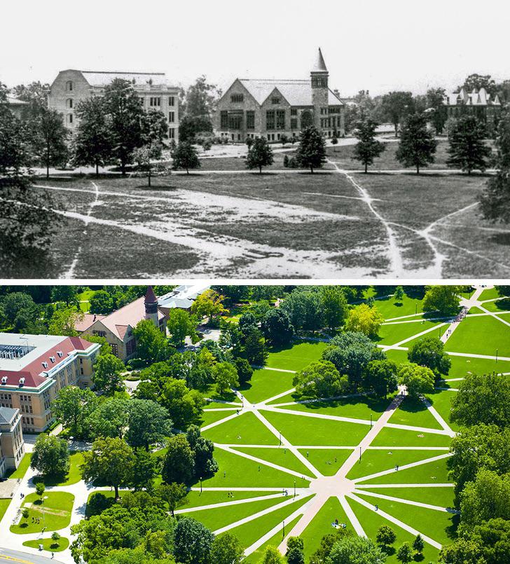 The first image is from the Ohio State University, where the university made a massive lawn as a green addition to its campus. Over time, staff and students created something called desire paths. These paths are formed when people walk a less time-consuming and/or easier path to their destination. Crossing the grass to get to class was easier and quicker than walking around the lawn. The campus had two choices: Close off the lawn with a fence to keep the grass pretty or use it to design paths on campus. They did the latter of the two choices and developed paved roads based off-of these desire paths to make life easier for students. This is a principle urban designers now use to create effective road systems and for UX/UI designers.